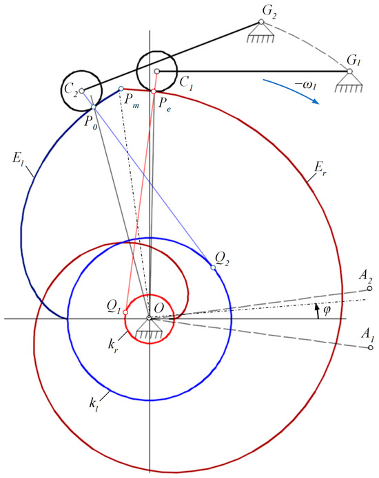 Figure 6 presents the cam profile necessary to generate the required reference piecewise characteristic for the recuperating moment. The cam profile consists of two involutes, denoted as left involute (El) and right involute (Er), with concentric base circles kl and kr, respectively. The involute cam was originally introduced by Shaw [35,36]. The three-arm rocker rotates around the center of the revolute joint O, which coincides with the centers of the two base circles. The involute’s property, where its normal is tangential to the base circle, is utilized to ensure a constant force arm between the roller and the cam. The transition between the two sections of the involute is accomplished by a cusp point Pm.