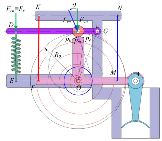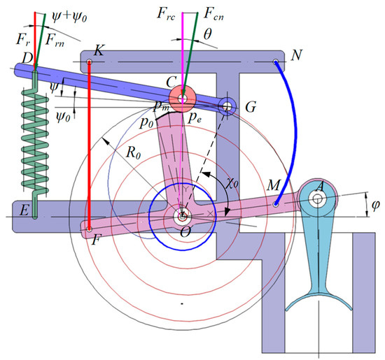 where , , is the force of the recuperative spring, is the pressure angle, is the output cam angle, and is the initial output cam angle (Figure 7).