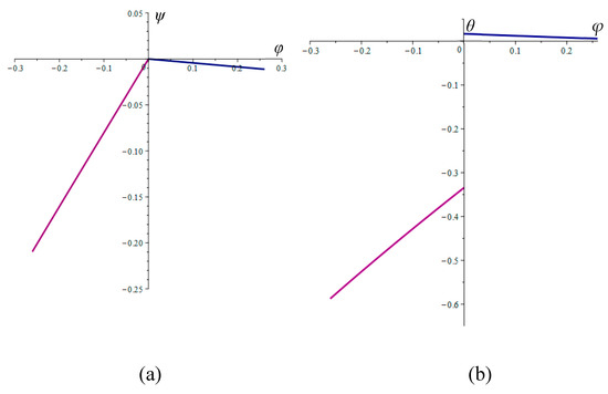 The next step of synthesis is to find the output angle using (17) where and are substituted. To avoid the multiple solutions, including those of complex number type, it is recommended to search for the roots of the Equation (30) in an interval close to , where and , respectively, for the right and left evolute. Considering that the stiffness of the spring is expressed from (10) as