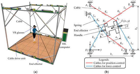 The overall structural model is shown in Figure 1a. The system consists of the end effector (operation object), cables, cable drive units, and VR glasses. Cable drive units use the rod nut slider mechanism to drive the cable’s movement using the slider’s movement.