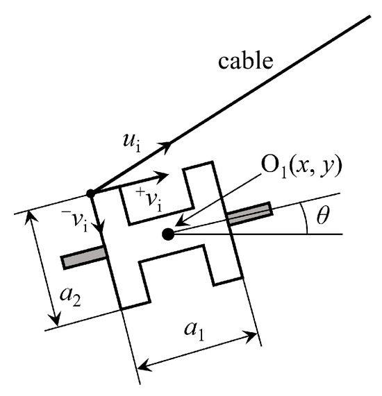 A plane mechanism, which is shown in Figure 1b, is used as an example to analyze the principle of the training system. The end effector of the actuator is the operation object of the astronaut. The red cables comprise LP (L1, L2, and L5); the blue cables comprise LF (L3, L4, and L6). The drive ends of the cables (A1~E1) are distributed at the edge of the actuator, and the other cable ends and the three vertices of the end effector (A2, B2, and E2) can be linked together. The cables drive the end effector’s motion in order to control the position and pose of the end actuator. Moreover, this achieves the plane’s 3 DOF motion (), namely x- and y-direction displacement and rotation around the z-axis.