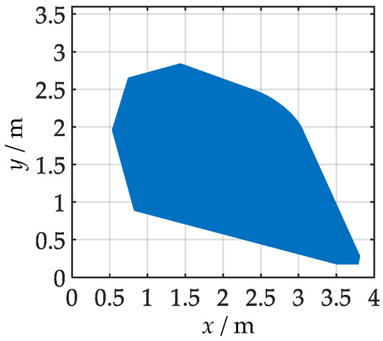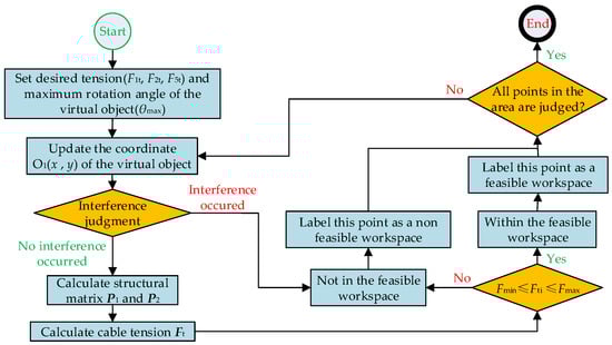 The basic steps for solving the system’s workspace using the point-by-point comparison method are shown in Figure 5. Firstly, the motion region of the end effector is discretized into several points. Then, substituting the desired tension of LP into Equation (11), the loading tension of LF can be obtained. If the obtained loading tension is within the allowable tension range and meets the non-interference condition, then the current working point is within the feasible working area; otherwise, the current working point is not within the feasible working area. Finally, whether each point meets the motion conditions in a sequence is determined, and all points that meet the conditions are combined to form the feasible working range of the system.