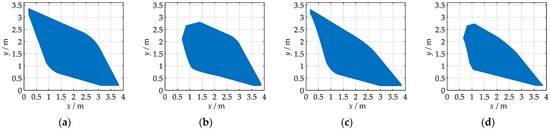 System workspace: (a) F1t = 60 N, F2t = 60 N, F5t = 50 N, and θ = 0°; (b) F1t = 60 N, F2t = 60 N, F5t = 50 N, and θ = 15°; (c) F1t = 40 N, F2t = 40 N, F5t = 70 N, and θ = 0°; (d) F1t = 40 N, F2t = 40 N, F5t = 70 N, and θ = 15°.
