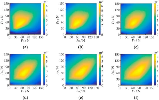 Area comparison in the workspace: (a) F5t = 30 N; (b) F5t = 40 N; (c) F5t = 50 N; (d) F5t = 60 N; (e) F5t = 70 N; (f) F5t = 80 N.
