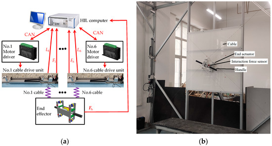 Finally, the tension control model, cable length control model, and new composite control strategy were verified as correct and effective using experiments. The new composite control strategy significantly improves the motion accuracy of the end effector. Moreover, the motion control accuracy of the system is not substantially affected by changes in the virtual object’s parameters. By changing the virtual object’s parameters, the system can achieve training tasks such as transporting, disassembling, and anti-collision of objects of different masses.