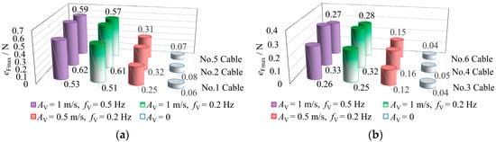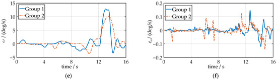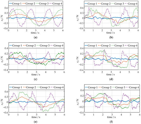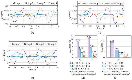 To evaluate the effect of the new composite control strategy on the improvement of end effector control performance, four groups of comparative experiments were performed. In each group of experiments, the desired tension of LP exhibits sinusoidal curves with different amplitudes and frequencies. The median values of the sine curves are F1t = 63 N, F2t = 57 N, and F5t = 50 N. The tension’s amplitude and frequency parameters are shown in Table 4. The controller’s parameters are shown in Table 2. Figure 12 shows the velocity errors of the end effector and the comparison of maximum velocity errors. The x direction is the horizontal direction, the y direction is the vertical direction, is the maximum value of velocity errors, and is the maximum value of angular velocity errors.