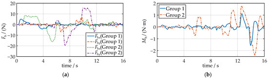 During the experiment, the astronaut operated the object according to the motion trajectory of the object shown in Figure 13. Two groups of experiments were conducted, and the virtual environment parameters of each experiment are shown in Table 5. These two groups of experiments show the performance of the system under different virtual mass and inertia parameters. The controller’s parameters are shown in Table 2; the astronaut’s interaction force and interaction moment curves are shown in Figure 14; the tension errors of LP are shown in Figure 15; the desired velocities and velocity errors of the end effector are shown in Figure 16.