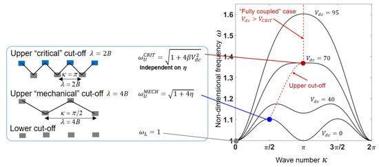At certain critical finite value V, the wavenumber reaches its maximum . The corresponding upper cut-off is independent of the mechanical coupling parameter (since within each half-array all are identical; see Figure 2). For , the electrostatic coupling is dominant, and, while increases with increasing , is voltage-independent.