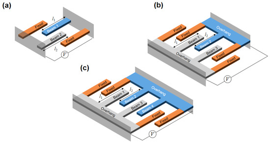 Schematic view of (a) two, (b) three and (c) four beams array. In (a) the beams are coupled only electrostatically; in (b,c) the beams are also coupled elastically within the half-arrays. The beams shown in orange color are unmoving to enforce the “boundary conditions” of the array.