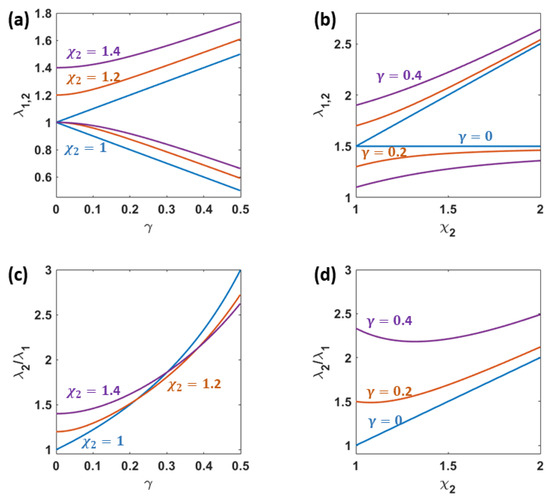Two beams array: (a) Dependence of the eigenvalues , Equation (8), on the ES coupling parameter for several values of the detuning parameter ; (b) as the function of the detuning for several values of . (c,d) depict the same dependencies of the eigenvalues ratios .