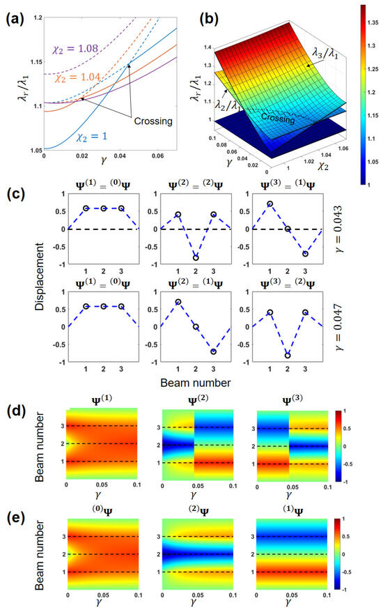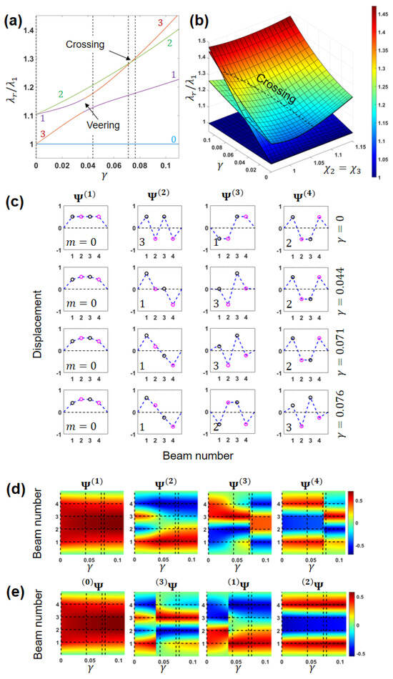 Four beams array: (a) Dependence of the eigenvalues ratio of a uniform array on the ES coupling parameter . Numbers and colors correspond to the number of nodes m in the eigenvectors: (blue), (purple), (green), and (orange). (b) Eigenvalues ratios of a symmetric non-uniform array vs. coupling and detunings . Crossing is depicted by the dashed line. (c) The eigenvectors of the uniform array for in the vicinity of the veering and the crossing values, shown by the vertical dashed lines in (a). The horizontal axis shows the beams numbers. (d) Evolution of the eigenvectors with the increase in for the case of the uniform array. (e) The evolution of . Color bars in (d,e) represent the normalized displacements. Vertical dashed lines correspond to the values of in (c). and in (c–e) denote the eigenvectors ordered by the eigenvalue and by the number of nodes m, respectively.