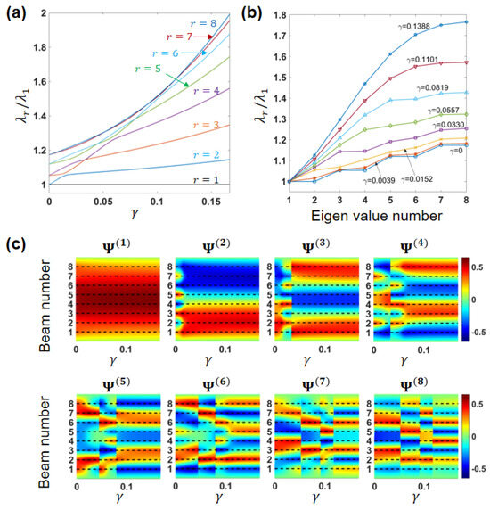 Uniform eight beams array: (a) Evolution of the eigenvalues ratios with the ES coupling parameter . (b) Frequency curves−the full set of the eigenvalues ratios for several values of . (c) Evolution of the eigenvectors (ordered by the eigenvalue ) with .