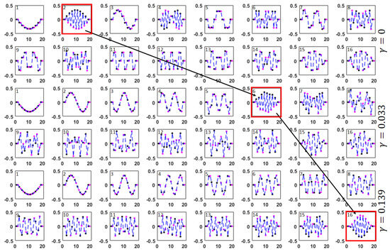 Unform 16 beams array: three full sets of the eigenvectors for three different values of the ES coupling parameter . The horizontal axis shows the beams numbers. The number in the upper left corner is the associated eigenvalue number r. The two upper rows correspond to the ES uncoupled case ; the two bottom rows depict the case of the full coupling ; the middle two rows correspond to . The vector with the largest number of nodal points is marked by the bold red frame.