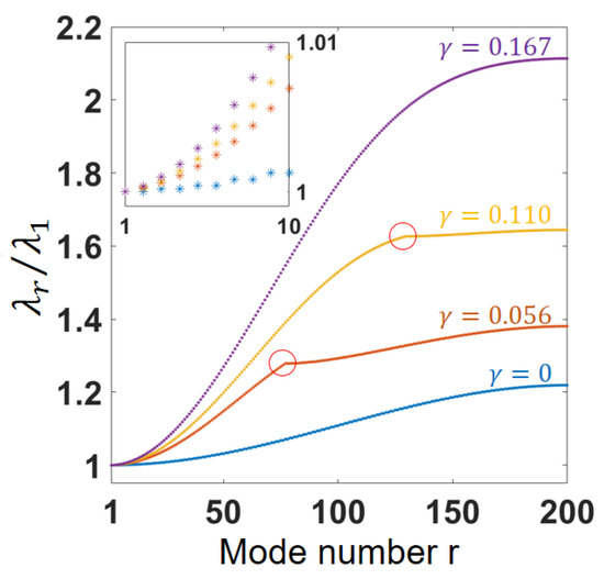 Finally, we present the results for the large 200-beam array. Recall that all the calculations are carried out for the array with dimensions reported in [17,21], Table 1. Figure 9 shows the full set of the eigenvalues ratios for few values of below and above the critical value (also, here, the markers corresponding to the same are connected by a line). Note that in accordance with our results, the critical ES coupling parameter for an infinite array can serve as a limiting value of for a (sufficiently large) finite array. One observes that for , the specific mode number exists, such that there is a discontinuity (fold) in the slope of the curve. The eigenvector corresponding to is the vector with the maximal number of the nodal points. For , the eigenvectors resemble those of the fully coupled array (as in the first five images of the third row in Figure 8). On the other hand, for , the eigenvectors are in a sense similar to the independent modes of each of the half-arrays. This behavior is attributed to the fact that the relative displacement between the adjacent elements of the arrays is more pronounced for higher modes, and therefore a higher voltage is required to achieve full coupling.