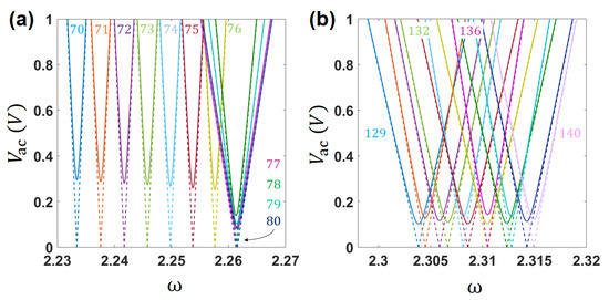 Figure 13 illustrates the single mode undamped response of the array at few specific modes and 80. The left column Figure 13a,c presents the weakly coupled case where , while the right column presents the case of the full coupling V. The differences in the (single mode) parametric resonant responses of the array subject to the strong and weak ES coupling manifest themselves in several aspects. As expected, for the same mode, higher results in the stiffening of the array and therefore in the shifting of the frequencies where the PR is exited toward higher values. For example, in the subcritical case and for , the width of the PR region is such that and (Figure 13c, purple line). In the supercritical case, Figure 13d, the values are higher and the band is narrower, such that and . An additional difference is the overlap between the modes, namely, the range of frequencies where PR can be excited. In the subcritical case, the PR frequency bands corresponding to the modes 60, 70, and 80 are almost fully overlapped, Figure 13a,c; no overlap is observed in the supercritical case, Figure 13b,d.