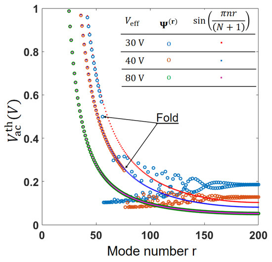 Here, in accordance with Equation (20), depends only on and not on and separately. Figure 11 illustrates the influence of the mode number on for two different values of below , namely V, V, and one above it V (the fully coupled case). In general, an increase in results in a decrease in . In addition, is generally higher for lower modes of the array. However, the behavior is quite different for the subcritical and supercritical fully coupled cases. In the fully coupled case monotonically decreases with the mode number. In contrast, in the subcritical case, this monotonic dependence is preserved only for r below , which is the mode number corresponding to the eigenvector and to the fold in the frequency curve, Figure 9. At the pronounced decrease in occurs, and for , the dependence of on r becomes to be irregular. In accordance with Figure 11, for certain r, excitation of PR in the subcritical case can be achieved at lower and voltages than in the fully coupled case. This behavior can be attributed to the fact that at the array vibrates at a predominantly staggered mode, when the beams of the two half-arrays vibrate at the anti-phase. In this case, each of the half-arrays is in a sense excited independently, when the beams of the opposite half-array serve as an electrode. It is remarkable that when the eigenvectors of a uniform “fully coupled” mass-spring chain are used as the base vectors in the assumed modes procedure, the decrease in the threshold voltage and the irregular dependence of on the mode number are not captured by the (singe DOF) model.