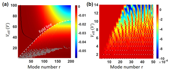 (a) The value of the nonlinear parameter in Equation (19) as a function of and the mode number r. The black dotted line corresponds to the transition from hardening to softening . (b) Zoomed-in view of (a) for low mode numbers and low coupling voltages.