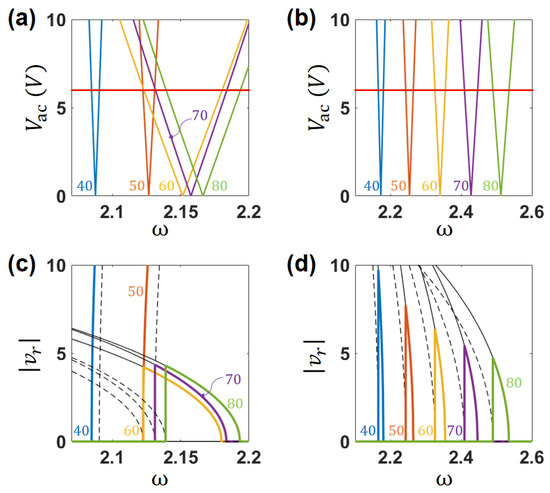 Single DOF RO model: Transition curves corresponding to the modes and 80 (numbers) for (a) the case of a weak ES coupling V and (b) the fully coupled case . (c,d) show the corresponding frequency responses for the same number of mode r as in (a,b) and for the same actuating ac voltage of V shown by a horizontal orange line in (a,b). Thin solid and dashed black lines correspond to the stable and unstable asymptotic solutions, Equations (29) and (30), respectively. Colored lines represent the response which would be obtained by up-swiping the driving frequency.