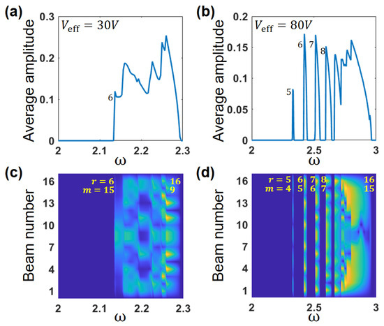 The amplitude–frequency response, in terms of the spatially averaged deflection amplitudes is shown in Figure 14a for V, the same response for V is depicted in Figure 14b. In both cases, excitation frequency increases starting from the value below the PR band of the entire array. The response follows the trivial stable branch until the frequency , Equation (31), corresponding to the left transition curve of the lowest excited mode is reached. Since, in our case, the actuating voltage is lower than the parametric threshold for the few lowest modes, these modes are not excited through the PR mechanism. Following the jump at , the response follows the stable branch, Equation (30). The amplitude decreases either down the trivial stable response at , or until the excitation frequency reaches the value corresponding to the unstable branch of the next mode in the sequence. The comparison of the responses shown in Figure 14a,b indicates that in the weakly coupled case, the full overlap between the modes is observed within the entire range of frequencies where the PR is excited, starting from the mode . In contrast, in the fully coupled case, the lowest modes excited through the PR mechanism are not interacting (modes 5 to 8) and the overlap is observed starting from the mode . In addition, consistently with the asymptotic analysis for the single-mode response, the range of the excitation frequencies, where the PR is excited, is wider in the fully coupled case. Moreover, since is generally higher for smaller , the first mode excited in the weakly coupled case is (which for this also corresponds to the , as in Figure 8, the third row), as opposed to in the fully coupled case. The situation is further illustrated in Figure 14c,d where the standing wave pattern for the cases described above are shown. The separation between the first excited modes 5 to 8 in Figure 14d is clearly observed. In contrast, in Figure 14c the modes are overlapping within the entire frequency range where the PR is excited. Note that since the colors in Figure 14c,d represent the modal amplitudes, the negative deflections are not shown (e.g., see [17]). For this reason, in the fully coupled arrays, namely Figure 14d, the pattern of the modes and look qualitatively similar. In contrast, in the case of the weak coupling, Figure 14c, the first mode excited through the PR is , which looks similar to the mode . As a result, the “wavelength” of the modes always decreases with the increase in the frequency above the value associated with . This behavior is consistent with the results shown in Figure 8.