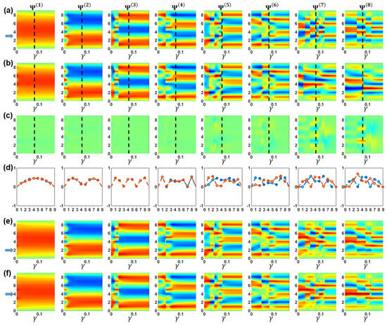 Influence of the local mass perturbation on the modal pattern: (a) Evolution of the eigenvectors (ordered by the eigenvalue) with the ES coupling parameter for the uniform eight beams array, Figure 7c. (b) The mass is increased by . The color bar limits are [−0.707, 0.707]. (c) The difference between the perturbed and the unperturbed patterns shown in (a,b), respectively. The color bar limits are [−1.414, 1.414]. (d) The eigenvectors of the unperturbed (blue) and perturbed (brown) array for (shown by the vertical dashed lines in (a,b). The horizontal axis shows the beams numbers. (e) The mass is increased by . (f) The mass is increased by . The color bar limits are [−0.707, 0.707].