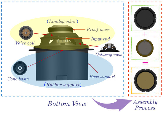 The inertial actuator consists of several essential components, such as an electromagnetic coil, permanent magnet, elastic element, and base. Its operation relies on supplying power to the electromagnetic induction coil, which induces specific and regular changes in the surrounding magnetic field. As a result, the Lorentz force is generated, propelling the reciprocal motion of the actuator and permanent magnet. With these fundamental principles and components in mind, it becomes apparent that the loudspeaker principle seamlessly aligns with the inertial actuator. Therefore, it is possible to modify a loudspeaker as an inertial actuator, as depicted in Figure 1.