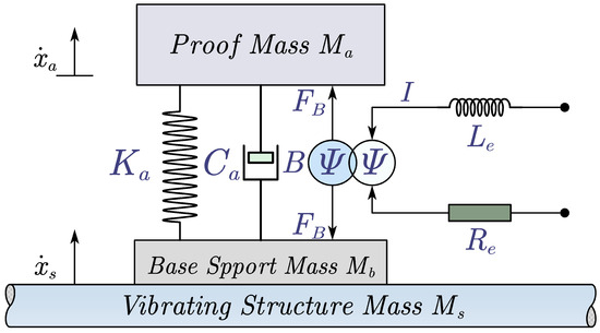 where is the input voltage of the inertial actuator, and and are the displacement of the proof mass and base support of the inertial actuator, respectively.