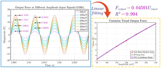During the variable amplitude output force response test, a range of sinusoidal signals with frequencies of 155 Hz and varying amplitudes were employed. The selected test signal had an input voltage from 50 mV to 350 mV, with test points recorded at 50 mV intervals. By utilizing Newton’s second law, the acceleration signals accurately portrayed the mechanical performance of the actuator. The experimental results are presented in Figure 5.