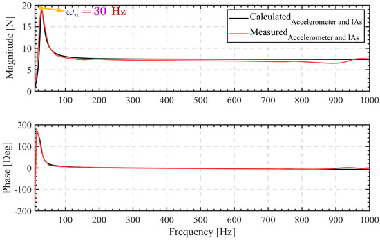 For the variable frequency output force response test, a sinusoidal signal ranging from 10 Hz to 1000 Hz with an amplitude of 100 mV was utilized. Figure 6 illustrates that the natural frequency of LBIA is 30 Hz due to the accelerometer mass. Notably, the inertial actuator’s output control force remains relatively stable in both magnitude and phase when the frequency exceeds the natural frequency. In this frequency band, the inertial actuator effectively functions as an exciter, producing an ideal point force output. Additionally, the frequency response test results of the actuator align closely with the transfer function of the theoretical model. The bearing shape and output force characteristics were also verified in [45].