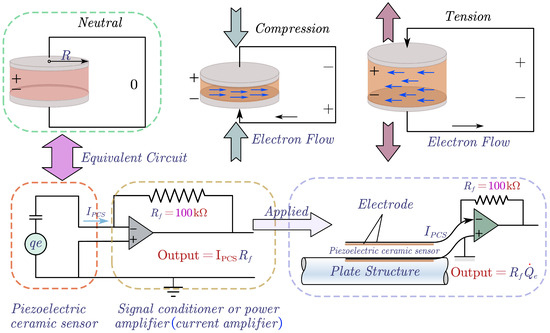 Figure 7 illustrates the behavior of the piezoelectric ceramic sensor under the influence of a stress field. When the sensor senses structural vibrations, it generates the corresponding induced electricity. According to [46], the induced charge generated by piezoelectric ceramic sensors can be described by Equation (8) as follows: