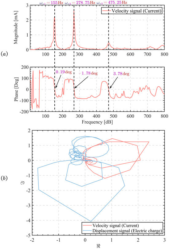 Meanwhile, Figure 8b experimentally illustrates the Nyquist diagram of the open-loop transfer function testing before and after signal conditioning of the sensor in the LBIA. The diagram demonstrates the sensor’s ability to convert its charge (displacement signal) into current (velocity signal) after signal conditioning. Notably, it can be seen from Figure 8a that effective vibration control is achieved when the phase detection indicates that the first and second modes are close to 0 degrees.