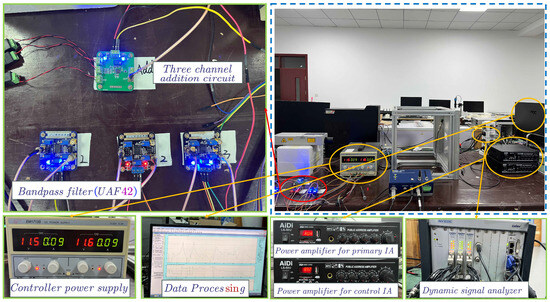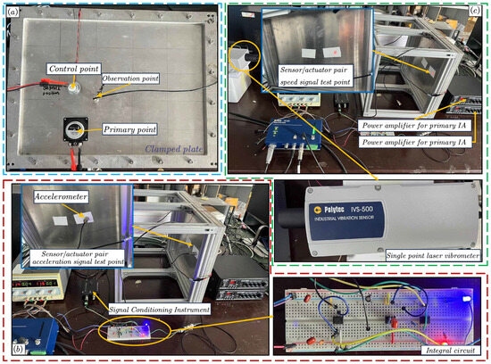 After establishing the controller model, it is necessary to conduct further testing to evaluate the actual control effect of the LBIA with an integrated piezoelectric sensor combined with a bandpass filter. To accomplish this, the focus of the study is placed on a thin plate as the research object. A dedicated experimental platform is built, as illustrated in Figure 14. This experiment serves as an extension of the previous experiments. The position arrangement is the same as in the previous experiment but different control algorithms are used.