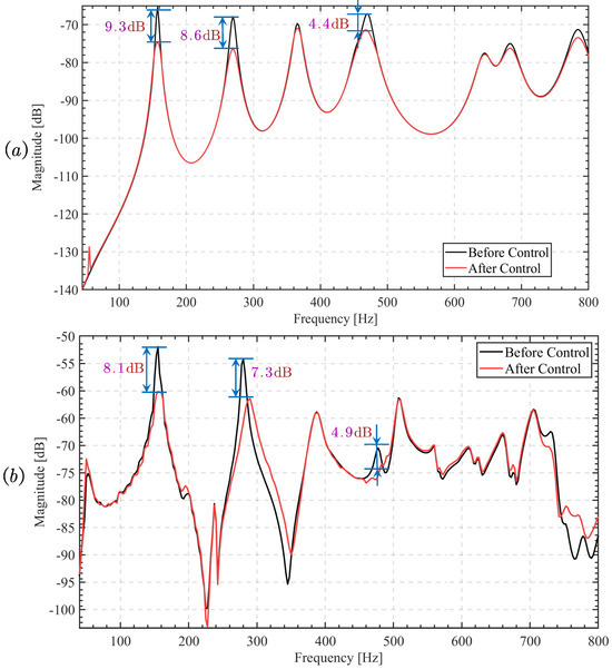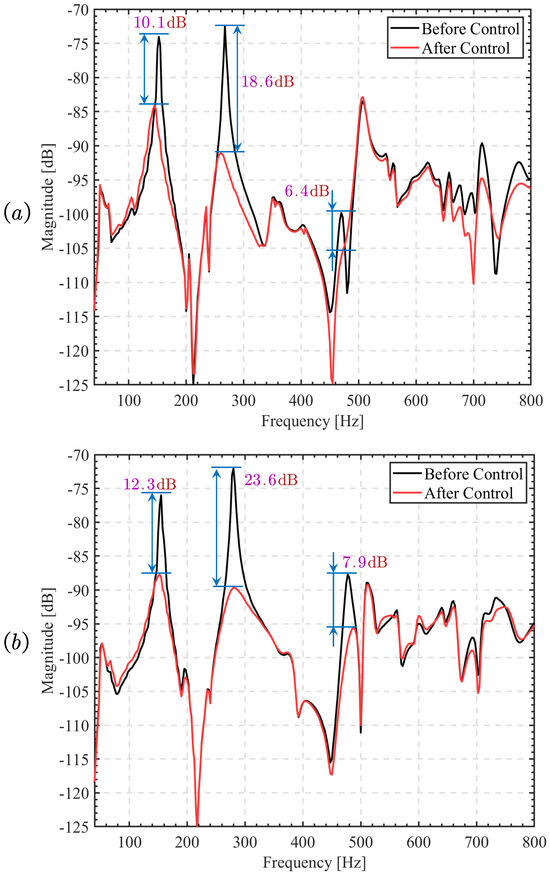 Moreover, the effectiveness of LBIA for active control of thin plate structures is experimentally verified through its traditional direct velocity negative feedback algorithm. Experimental verification is conducted using the velocity sensor and acceleration sensor on the thin plate structure. The results demonstrate the homemade inertial actuator’s effectiveness in controlling the first two modes of vibration of the thin plate structure and the fourth mode as well. The control effect is shown in Figure 10, with the observed reductions of 12.3 dB, 23.6 dB, and 7.9 dB being consistent with the numerical calculation results, thus confirming the superiority and reliability of the control design.