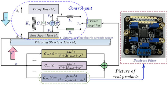 The LBIA employs an integrated piezoelectric ceramic sensor as the feedback mechanism. When the controlled structure is stimulated by , the feedback sensor collects its vibration velocity signal. Subsequently, this signal is fed into an N-branch parallel bandpass filter, where it undergoes integration through an adder. Finally, the signal is sent to the LBIA via a power amplifier to generate the corresponding controlling force , thus achieving closed-loop active control. Importantly, each bandpass filter’s natural frequency, damping ratio, and gain can be independently adjusted to suit specific requirements. The controller described is a parallel N-branch bandpass filter, and its output signal represents the summation of the basic velocity output from each branch bandpass filter, which can be expressed using the following Equation (16):