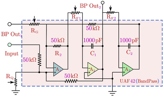 The primary objective of this experiment is to enhance the control effect of the LBIA with an integrated piezoelectric sensor by incorporating a low-cost, second-order bandpass filter, specifically designed using UAF42 (by Burr-Brown Inc., Tucson, AZ, USA). Figure 13 illustrates the schematic diagram of this specific bandpass filter.