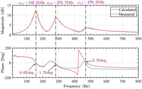According to Figure 15, the theoretical calculation of the bandpass filter is basically consistent with the experimental results. However, an interesting observation was made regarding a phase jump in the bandpass filter before reaching the third natural frequency of the control. Specifically, the phase first decays to −180 degrees and then rapidly jumps to approximately +180 degrees. This phase jump is a result of the relative positions of the poles and zeros of the filter. As the signal approaches the third-order operating frequency, the phase of the poles and zeros undergoes changes, leading to the occurrence of this phase jump. Additionally, at the operating frequency, the contributions of the poles and zeros to the phase cancel each other out, resulting in a phase of 0 degrees.