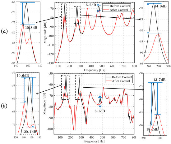 From Figure 10a, it can be observed that the integrated design of LBIA proves effective in actively controlling the thin plate structure. The vibration energy in the first and second modes reduces by 8.1 dB and 7.3 dB, respectively. There is also some suppression in the fourth mode.