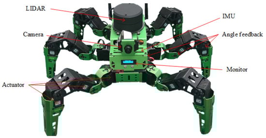 Each leg joint of the hexapod robot consists of a high-voltage servo, an angle feedback device, and a temperature and voltage sensor. The angle feedback device can record the rotation angle of each joint, and the temperature and voltage sensor can understand the internal data of the servo in real time, to protect the servo. As shown in Figure 2, the hexapod robot has an inertial measurement unit (IMU) and an 18-angle feedback as proprioceptive sensors, which form the sensor network of the hexapod robot.