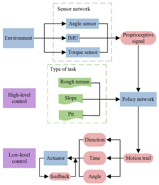 As shown in Figure 3, the control framework can be mainly categorized into two stages: low-level control, and high-level control. First, the proprioceptive signals are obtained from the environment through the sensor network, which can determine its own attitude and the ruggedness of the surrounding environment. In the high-level control, the policy network receives the human-selected task types and proprioceptive signals, and then it generates robot trajectories and gaits corresponding to the tasks. In the low-level control, the motion trajectory of each joint of the hexapod robot is decomposed into angles and motion directions at certain time intervals, and finally the joints are precisely rotated by the positional PID control through feedback from the angle feedback device.
