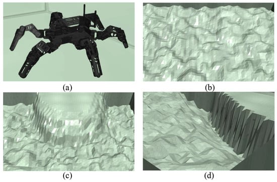 Hexapod robot and terrain models: (a) hexapod robot, (b) perlin, (c) slope, (d) pit.