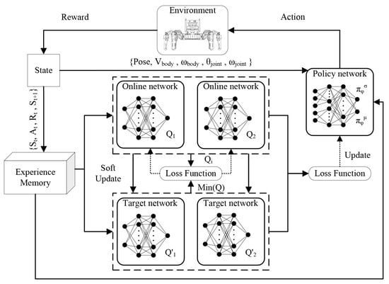 The interaction process between the hexapod robot and the environment uses MDPs, which satisfy the conditions for the use of RL. This paper uses SAC to train the motion strategy of the hexapod robot. SAC is a non-strategy DRL based on maximum entropy, where the introduction of maximum entropy gives a strong exploratory ability [43]. In addition, it has excellent robustness and high sampling efficiency, providing a stable learning framework for control tasks in continuous action space [44].