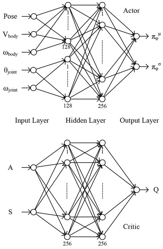 The neural network structure used by SAC is shown in Figure 7. In this paper, the structure of the actor is modified. Two micro-neural networks are first used to extract features for highly relevant inputs, and then the features are put into a fully connected neural network. The actor uses a strategy network containing four layers, with the first input layer and the second hidden layer consisting of two micro-neural networks, as the input and output layers of the micro-neural network, respectively. The first micro-neural network input layer is , and , and the output layer has 128 torso-related features. The second micro-neural network input layer is and , and the output layer has 128 leg-related features. The third layer of the strategy network is a hidden layer containing 256 units that combines the features extracted by the two micro-neural networks. The fourth layer is the output layer, which outputs the mean and the standard deviation of action obeying a Gaussian distribution. The critic, on the other hand, uses two online networks and two target networks with the same structure, the first layer being an input layer containing 64 units with inputs A and S, the second and third layers having the same structure as the actor’s hidden layer, and the fourth layer being an output layer that outputs the Q value, to evaluate the current action.