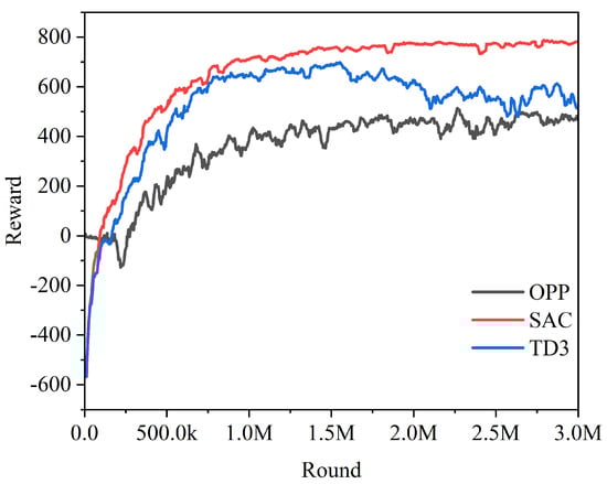 The larger the temperature coefficient , the stronger its exploration ability. The adjustment of the hyperparameter has a great impact on the training effect of the SAC, and needs to be adjusted for different tasks and different training cycles. A temperature auto-adjustment mechanism [45], which obtains the optimal temperature coefficients for each step by minimizing the objective function, is denoted as