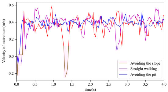 One objective of training a hexapod robot is a fixed walking speed, because the robot needs the right walking speed, no matter what terrain it is on. In this paper, the speed was set to 0.4 m/s for all three terrains of the training, or different speeds could be set separately. The walking speed of the trained hexapod robot is shown in Figure 9. In all three terrains, the robot started moving from rest, so the initial speed was 0 m/s. Then it accelerated to 0.4 m/s after an acceleration process of about 0.4 s, and stayed at about 0.4 m/s. Since all three terrains were rough terrains, the speed kept oscillating around the target speed. There was a strong deceleration process and acceleration process at around 1.3 s during the robot’s movement on the slope. The slowdown was due to the impassable slope, which hindered movement. After being blocked, the hexapod robot gradually changed its direction of movement, bypassed the slope, and accelerated to about 0.4 m/s, to continue walking.