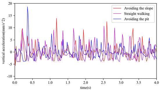 In this paper, the stability of robot motion was judged on the basis of the vertical acceleration, oscillations around roll, and oscillations around pitch during the motion process.The vertical acceleration during the motion on the three terrains is shown in Figure 10, and the vertical acceleration of the robot kept oscillating from around 0 at the beginning of the stationary motion to the uniform motion, and its amplitude mostly kept in the range of 5 mm/s to 10 mm/s. The robot showed a large change at about 0.4 s during the pit movement, since the robot moved to the edge of the pit and changed its direction of movement. The standard deviation for avoiding the slope was 3.05 mm, the standard deviation for straight walking was 3.24 mm, and the standard deviation for avoiding the pit was 2.67 mm. The oscillations around roll during the motion on three terrains are shown in Figure 11. The standard deviation for avoiding the slope was 0.023 rad, the standard deviation for straight walking was 0.033 rad, and the standard deviation for avoiding the pit was 0.025 rad. The oscillations around pitch during the motion on three terrains is shown in Figure 12. The standard deviation for avoiding the slope was 0.020 rad, the standard deviation for straight walking was 0.031 rad, and the standard deviation for avoiding the pit was 0.020 rad. From these figures, it can be seen that the standard deviations of vertical acceleration, oscillations in pitch, and oscillations in roll were small and the stability was acceptable.