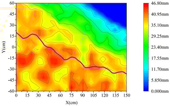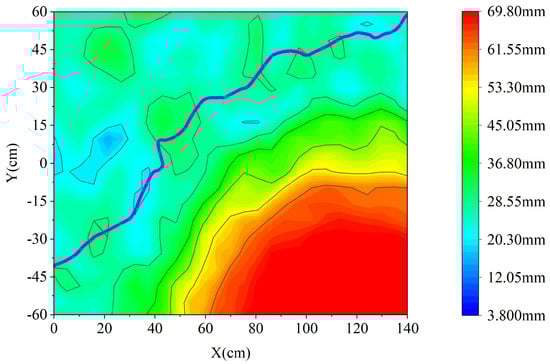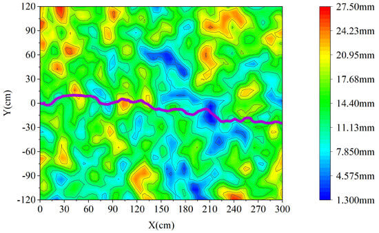 In this paper, contour maps were used to describe the paths of the hexapod robot moving over the three terrains. The purple curve represents the change in the center of gravity, and the color shading represents the altitude gradient. Figure 13 shows the motion path of the robot on perlin, for which the motion path of the robot was straight within a deviation of ± 25 cm. Figure 14 shows the motion path of the robot when avoiding pits; in the figure, the robot detects the pit at around x = 22 cm and then keeps moving towards the edge of the pit without stepping into it. Figure 15 shows the motion path of the robot when avoiding the slope, in which the robot detects the slope at about x = 30 cm, and then changes the direction of motion towards the top. In summary, the hexapod robot in this paper has the ability to walk and avoid obstacles in rugged terrain, and Figure 16 shows the performance of the hexapod robot in the simulator.