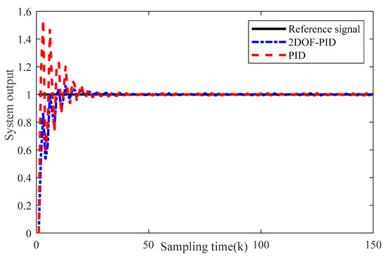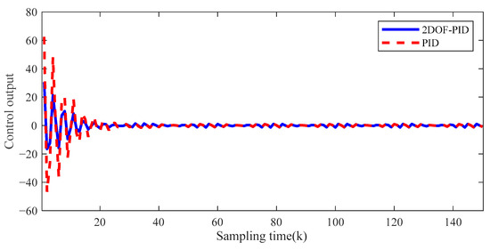 The disturbance rejection performances of single-degree-of-freedom PID control and 2-DOF PID control are compared in Figure 9 and Figure 10. When a disturbance is added to the system, the control input signals of the two control algorithms are shown in Figure 8. The control output response signals of the two control algorithms are shown in Figure 9. It can be seen that the single-degree-of-freedom PID has the same input disturbance rejection performance as the 2-DOF PID.