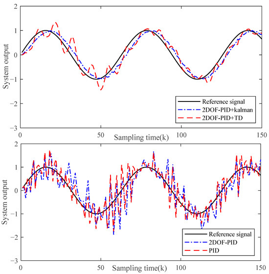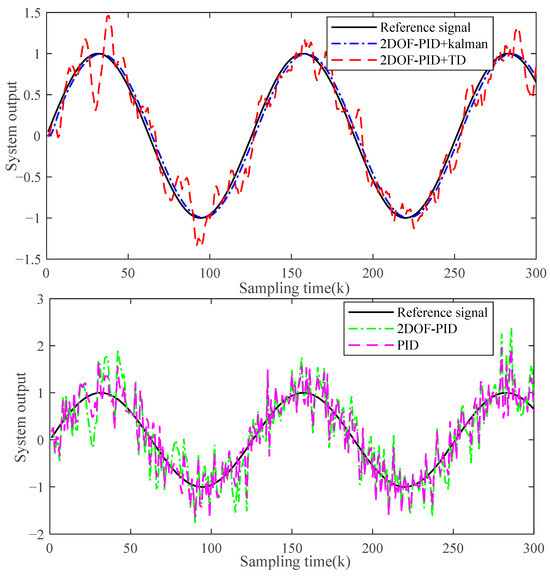 In order to compare and highlight the output noise suppression performance of the proposed control algorithm, it is assumed that the system is subjected to Gaussian white noise with an expectation of 0 and a variance of 0.04. The tracking results of different control algorithms for the system output with measurement noise are shown in Figure 12, where the tracking differentiator speed factor is taken as and the filter factor is taken as . The reference signal is taken as