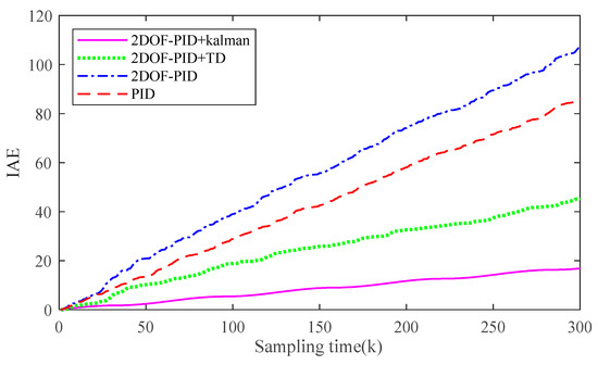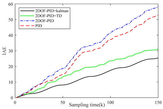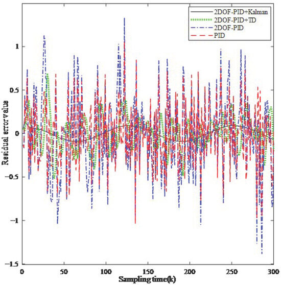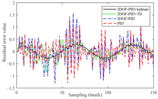 The residual error values of different control algorithms are shown in Figure 13. The cumulative control error results of different control algorithms are shown in Figure 14. We can see that the single-degree-of-freedom PID control algorithm struggles to suppress the influence of output measurement noise. Although the basic 2-DOF PID control algorithm can take into account the performance of input disturbance rejection and set point tracking, it makes up for the defect of the single-degree-of-freedom PID algorithm which can only guarantee one performance. However, when the system output is subject to random noise, the 2-DOF PID control algorithm cannot effectively suppress the uncertainty caused by the output noise. When the output of the system is subjected to measurement noise, for the 2-DOF PID control algorithm without the filter, the differential processing of by the controller may amplify the noise variance. The output with noise is processed directly by the 2-DOF PID controller. Single-degree-of-freedom PID processes the difference between the output containing noise and the reference signal , which results in less noise influence on the control result. The tracking differentiator is used to process the system output; it can be seen from Figure 11 and Figure 12 that there is still a large tracking error. The proposed 2-DOF PID control algorithm based on the Kalman filter can not only retain the input disturbance rejection performance and set point tracking performance of 2-DOF PID but also effectively suppress the uncertainty influence caused by output noise.
