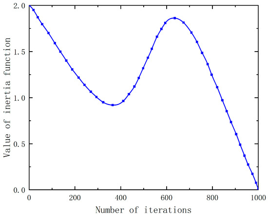 According to the experiment, wmin = 0.8 is the minimum value of the inertia factor; wmax = 2 is the maximum value of the inertia factor; K is the number of iterations; and Kmax is the maximum number of iterations, which was set to Kmax = 1000. The change in the w value is displayed in Figure 1: