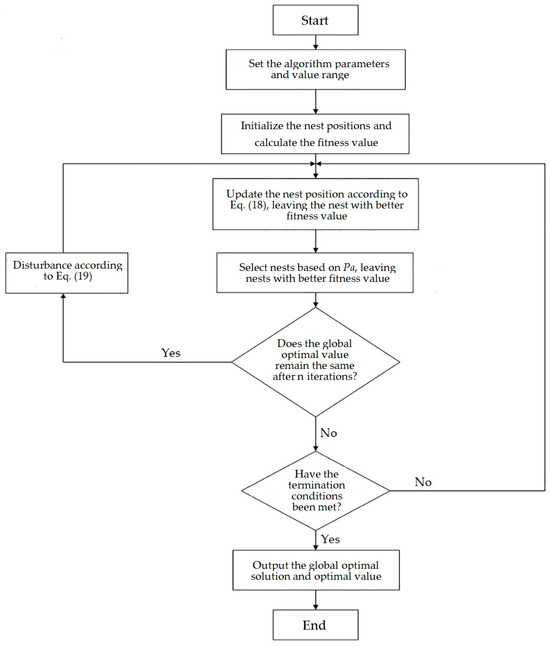 The specific implementation steps are as follows: The bird’s nests that kept the global optimal solution unchanged in repeated iterations were recorded. When the global optimal solution was unchanged in the n-th iteration of the bird’s nests, the current population was trapped in local optima, so it was disturbed at a disturbance step, which was the linear difference between the optimal solution of the current generation and the position of the bird’s nest. In this way, the algorithm was capable of optimization near the local optimal solution, ensuring that the algorithm could still remain convergent after the disturbance. The disturbance step length formula is as follows: